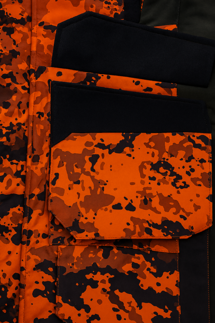 Denne orange camouflage leverer maksimal synlighed for mennesker, men bryder konturerne effektivt i naturen. Mønstret er designet til at skabe værdi dér, hvor det gælder – i selve camouflagen, der kombinerer sikkerhed, funktion og moderne performance.